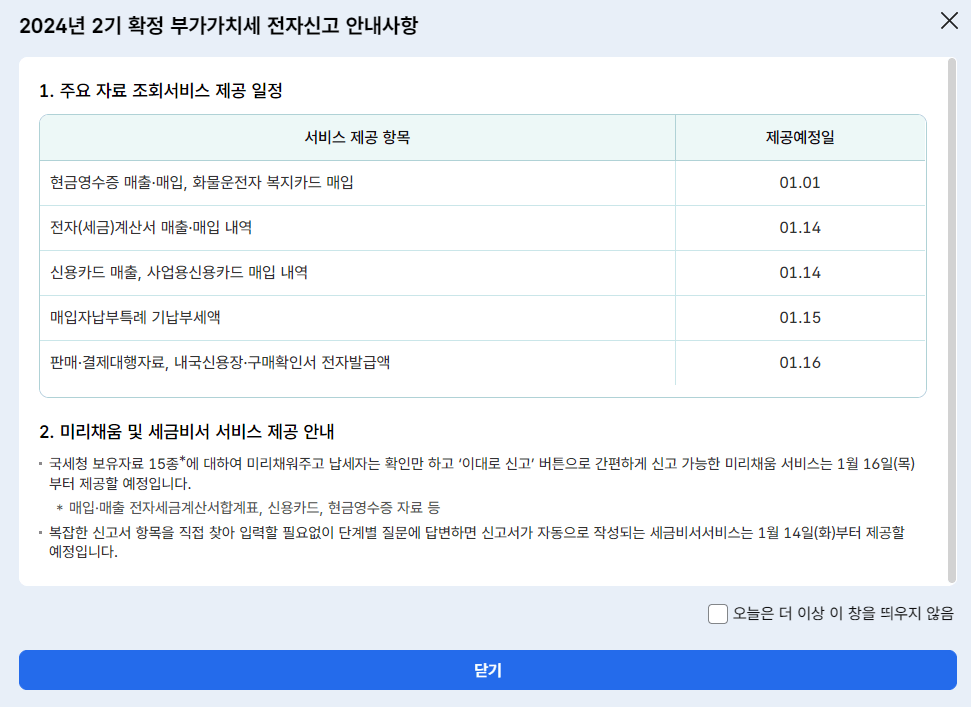 - 제2기 확정신고: 다음 해 1월 1일 ~ 1월 25일 (7월 1일 ~ 12월 31일 실적)